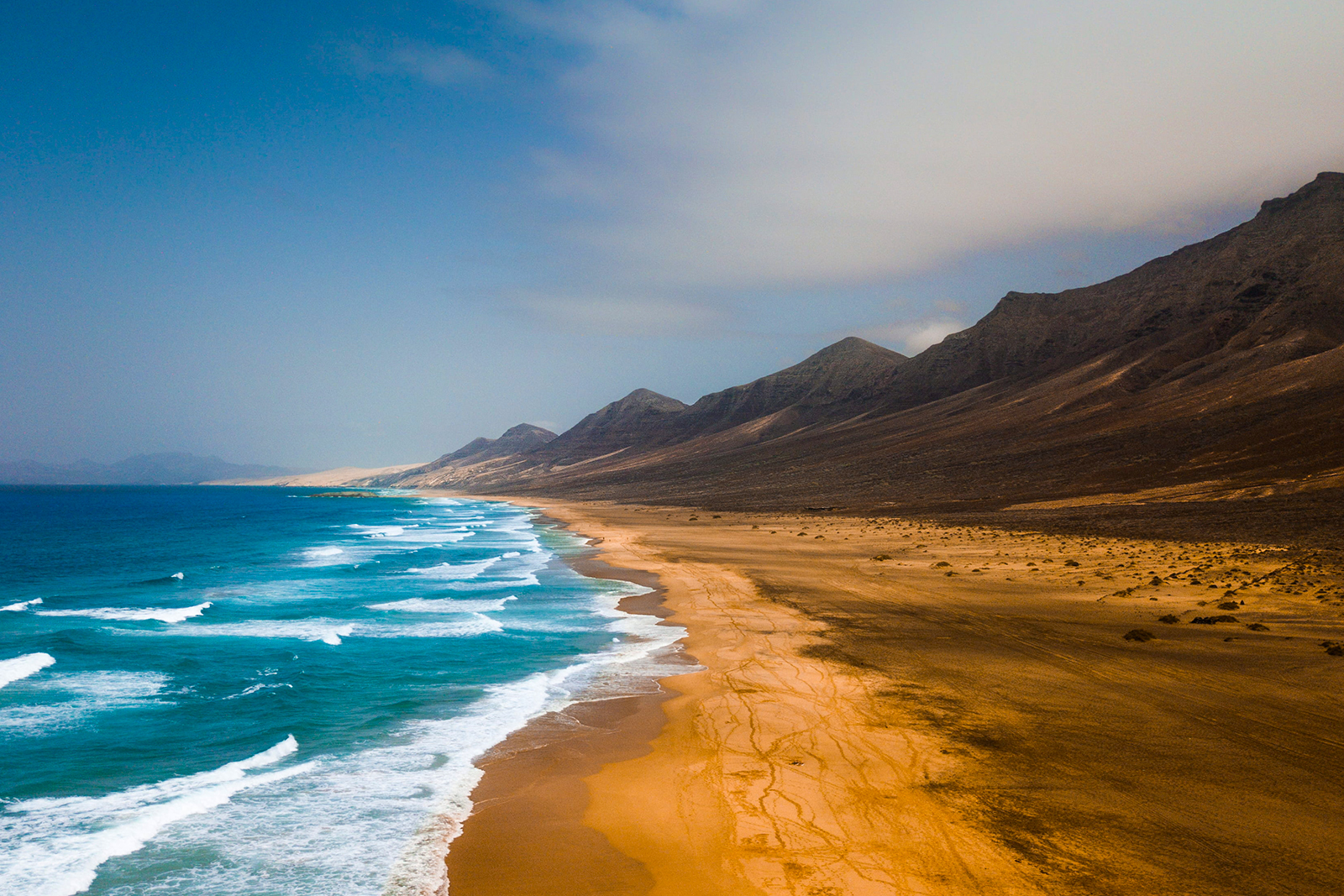 Fuerteventura, la segunda isla más grande de España, se encuentra en el océano Atlántico, a 100 km de la costa norte de África. Es conocida sobre todo como destino vacacional por sus playas de arena blanca y su calor durante todo el año, refrescado por los vientos constantes. La multitud de playas que la envuelven se ve interrumpida por acantilados y calas protegidas. Es popular para los deportes acuáticos, especialmente el surf, el windsurf y el esquí acuático.